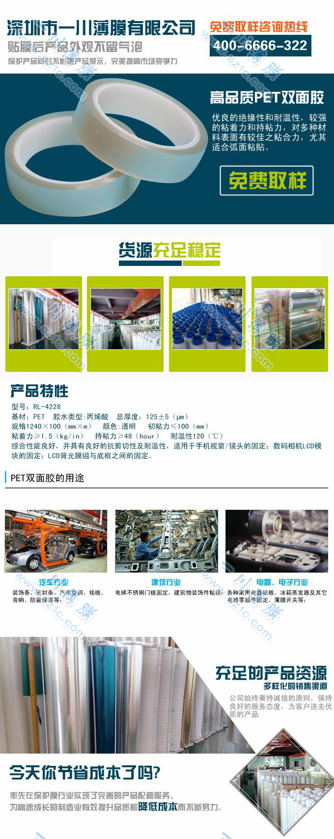 PET透明雙面膠帶以PET為基材,兩面涂壓克力膠水,具有優(yōu)良的絕緣性和耐溫性,較強的粘著力和持粘力,對多種材料表面(PET、PP、PE、PVC、ABS、PC、鋁材、鋼材等)有較佳之粘合力,尤其適合弧面粘貼(抗反彈性佳)。特別對PET薄膜具有較強的粘著力,廣泛用于薄膜開關的絕緣間隔片,銘板,標牌,面板,手機按鍵等!